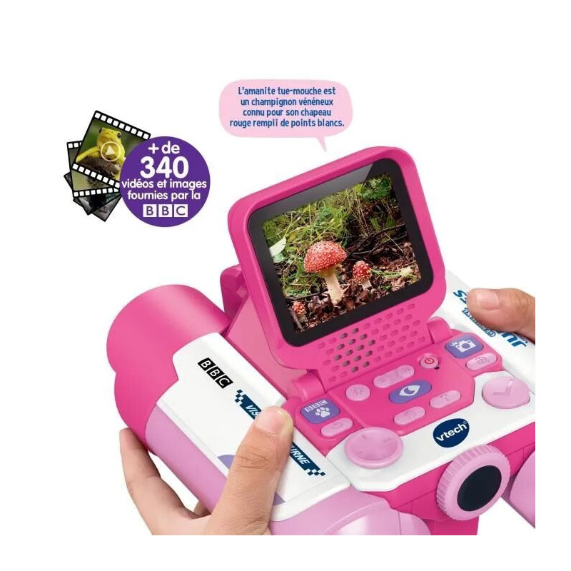 Il pourra également partir à l'aventure, regarder de plus près le monde qui l'entoure grâce au grossissement x10, et même capturer ses observations avec l’appareil photo intégré.