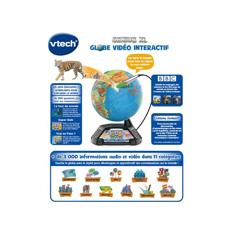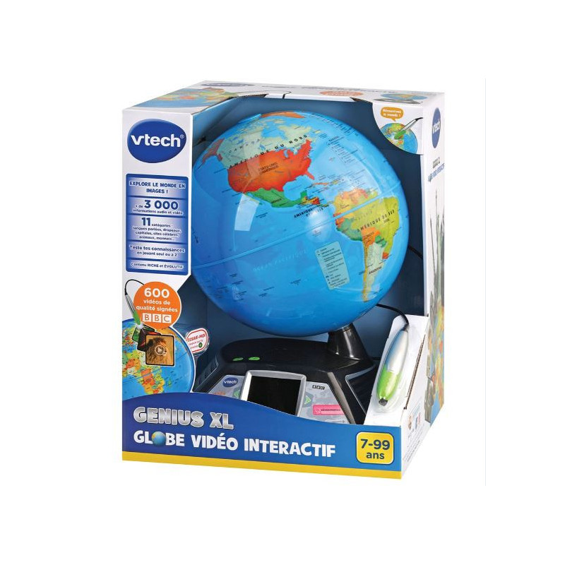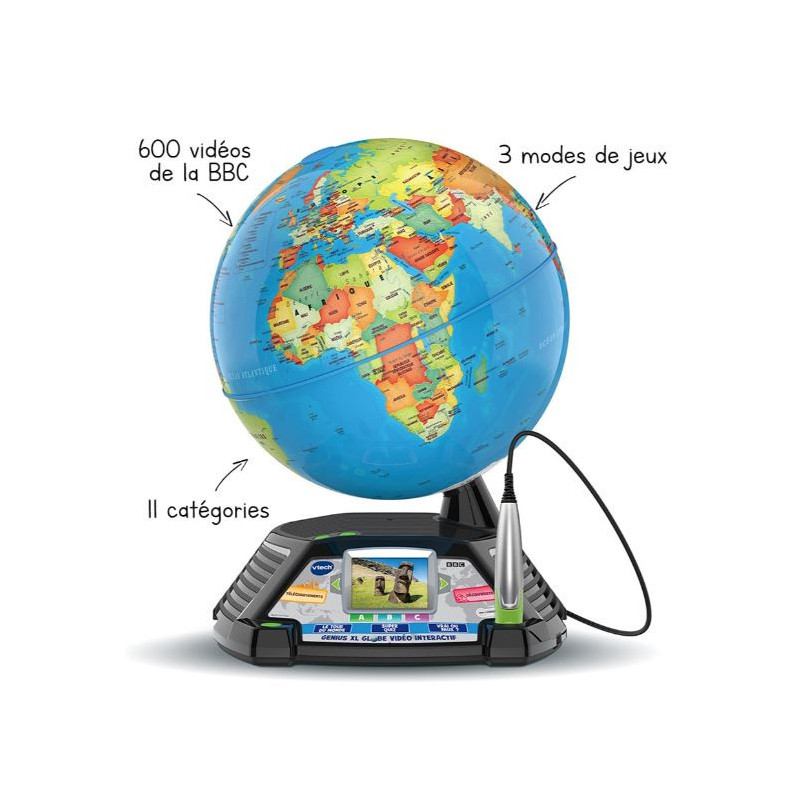 Le globe VTech Genius XL est un jouet interactif innovant qui permet aux enfants de découvrir le monde de façon amusante. Grâce à son stylet interactif et son écran vidéo couleur, le globe interactif VTech diffuse plus de 600 vidéos éducatives fournies par la BBC, sur les animaux, les monuments, les pays et les cultures du monde. Les enfants explorent la planète tout en jouant à des quiz et activités ludiques qui stimulent leur curiosité et leurs connaissances.