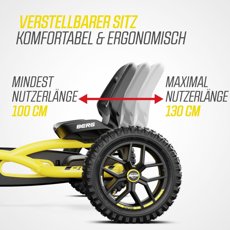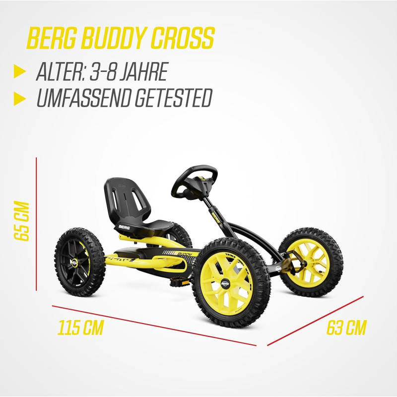 Le BERG Buddy Cross est un kart à pédales tout-terrain pour enfants de 3 à 8 ans. Avec ses pneus à crampons, son système BFR et son design sportif, il offre confort, sécurité et plaisir sur tous les terrains.