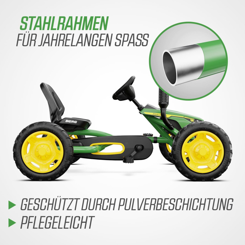 Le BERG Buddy John Deere est un kart à pédales solide et ajustable pour enfants de 3 à 8 ans. Design inspiré du célèbre tracteur John Deere, pneus tout-terrain et système BFR pour un pilotage fluide et sécurisé.